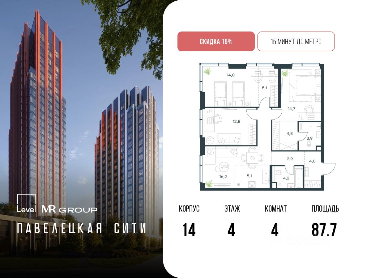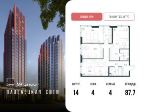 В Даниловском районе столицы (ЮАО) продаётся 4-комнатная квартира площадью 87.70 кв.м без отделки. Квартира расположена на 4 этаже 27-этажного корпуса 'Горизонт' в жилом комплексе бизнес-класса Павелецкая Сити. Высота потолков 3.00м.