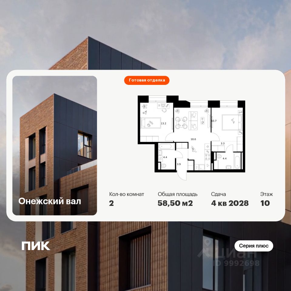 Новостройка! Продается 2-комн. кв-ра площадью 58,5 кв.м, (Корпус 1.1.3, Секция 3) 10 этаж 18-этажного дома в Онежский вал от ПИК. Квартал "Серии плюс" строится на севере Москвы, в 10 минутах пешком от станции метро "Селигерская" и МЦД "Моссельмаш". Проект понравится всем, кто привык к комфортной жизни и ценит возможность оставаться в ритме большого города и быстро добираться до центра столицы.