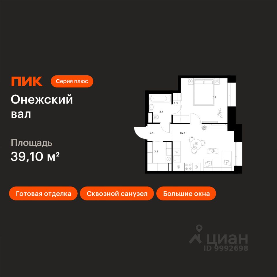 Продаётся 1-комн. квартира площадью 39,1 кв.м на 23 этаже 23 этажного дома (Корпус 1.1.1, Секция 1) проекта ПИК Онежский вал. Светлый просторный подъезд на уровне земли, функциональная планировка, большие окна, c отделкой.