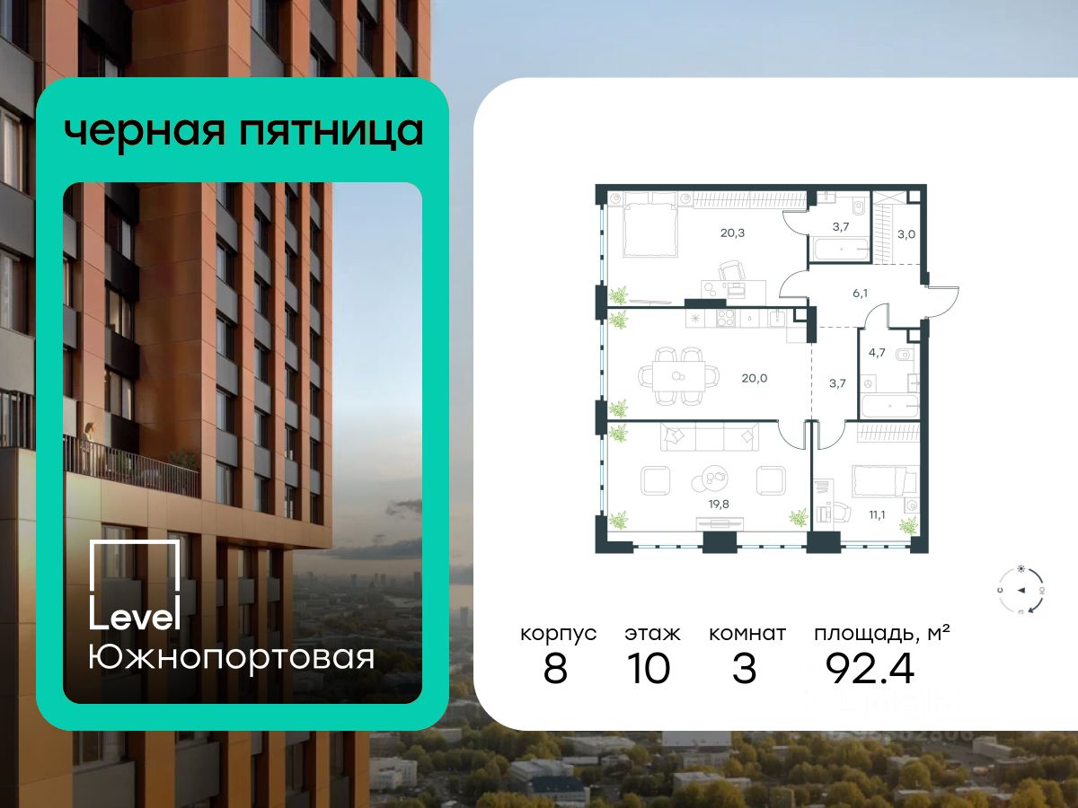 В северной части района Печатники продается 3-комнатная квартира площадью 92.40 кв.м без отделки. Квартира расположена на 10 этаже 49-этажного корпуса 8 в жилом комплексе комфорт-класса Level Южнопортовая (компания Level Group/Левел групп).