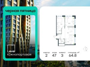 В северной части района Печатники продается 3-комнатная квартира площадью 64.80 кв.м без отделки. Квартира расположена на 47 этаже 47-этажного корпуса 2 в жилом комплексе комфорт-класса Level Южнопортовая (компания Level Group/Левел групп).