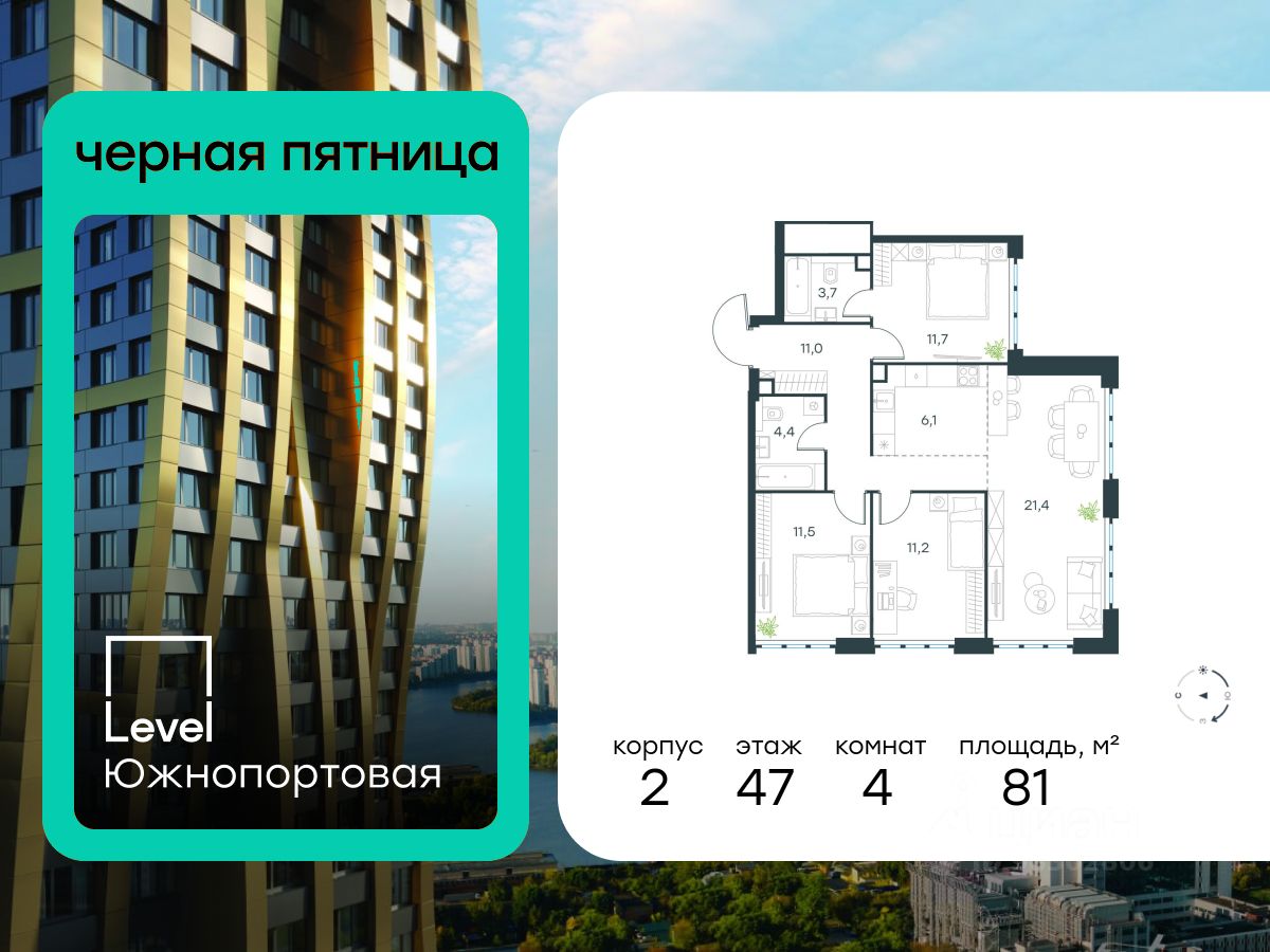 В северной части района Печатники продается 4-комнатная квартира площадью 81.00 кв.м без отделки. Квартира расположена на 47 этаже 47-этажного корпуса 2 в жилом комплексе комфорт-класса Level Южнопортовая (компания Level Group/Левел групп).