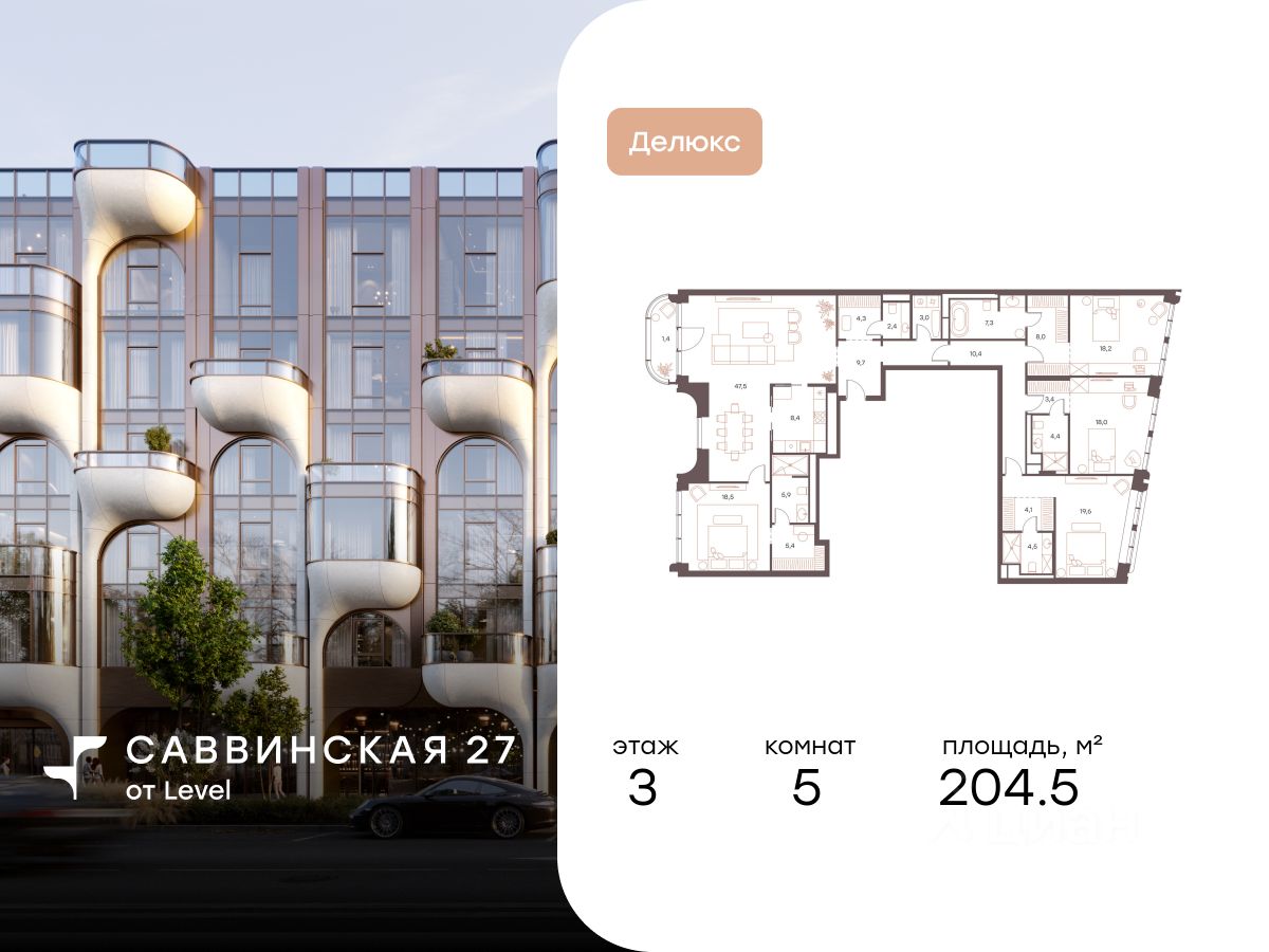 В историческом районе Хамовники продаются 5-к апартаменты площадью 204.50 кв.м, расположенные на 3 этаже делюкс-резиденции Саввинская 27 от Level.