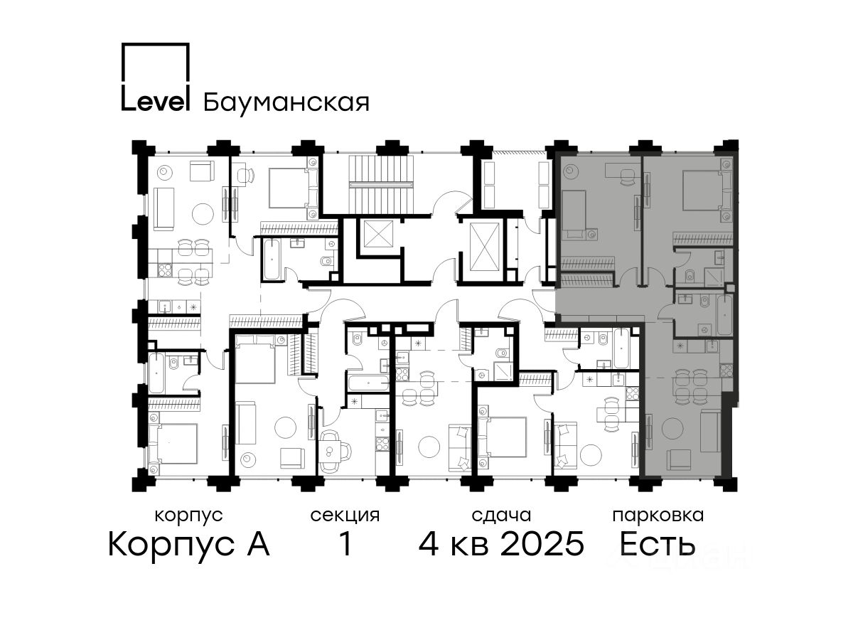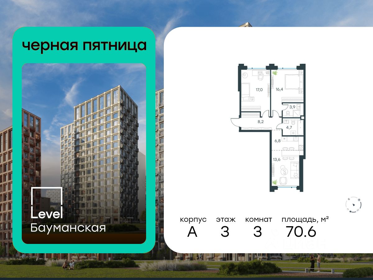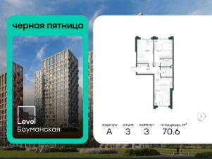 В Басманном районе (ЦАО) продается 3-комнатная квартира площадью 70.60 кв.м без отделки. Квартира расположена на 3 этаже 9-этажного корпуса " A" в жилом комплексе бизнес-класса Level Бауманская (компания Level Group).