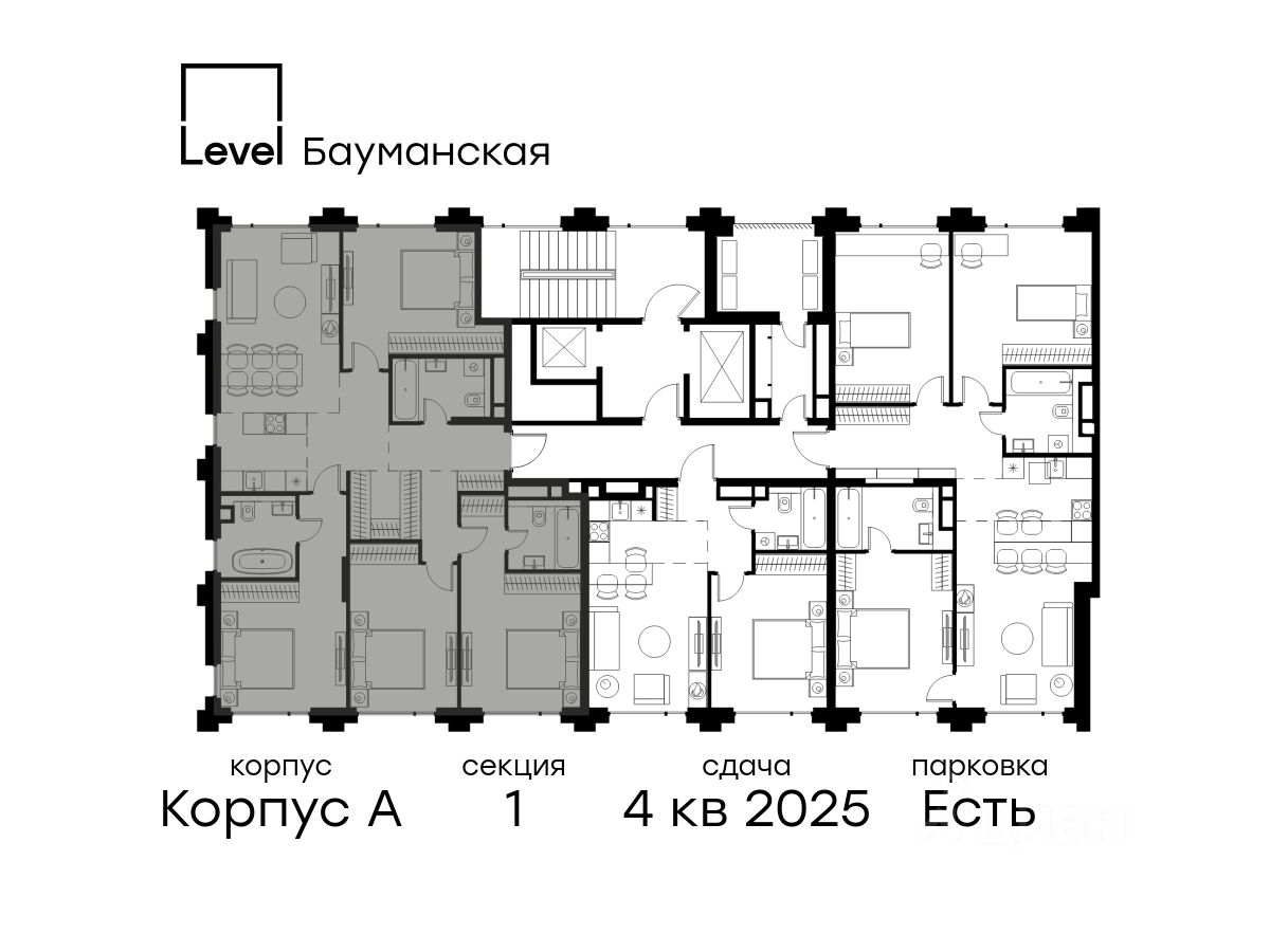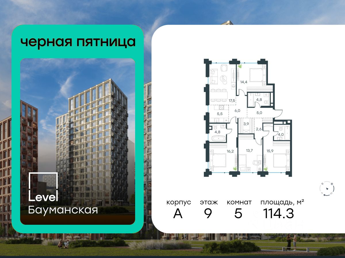 В Басманном районе (ЦАО) продается 5-комнатная квартира площадью 114.30 кв.м без отделки. Квартира расположена на 9 этаже 9-этажного корпуса " A" в жилом комплексе бизнес-класса Level Бауманская (компания Level Group).