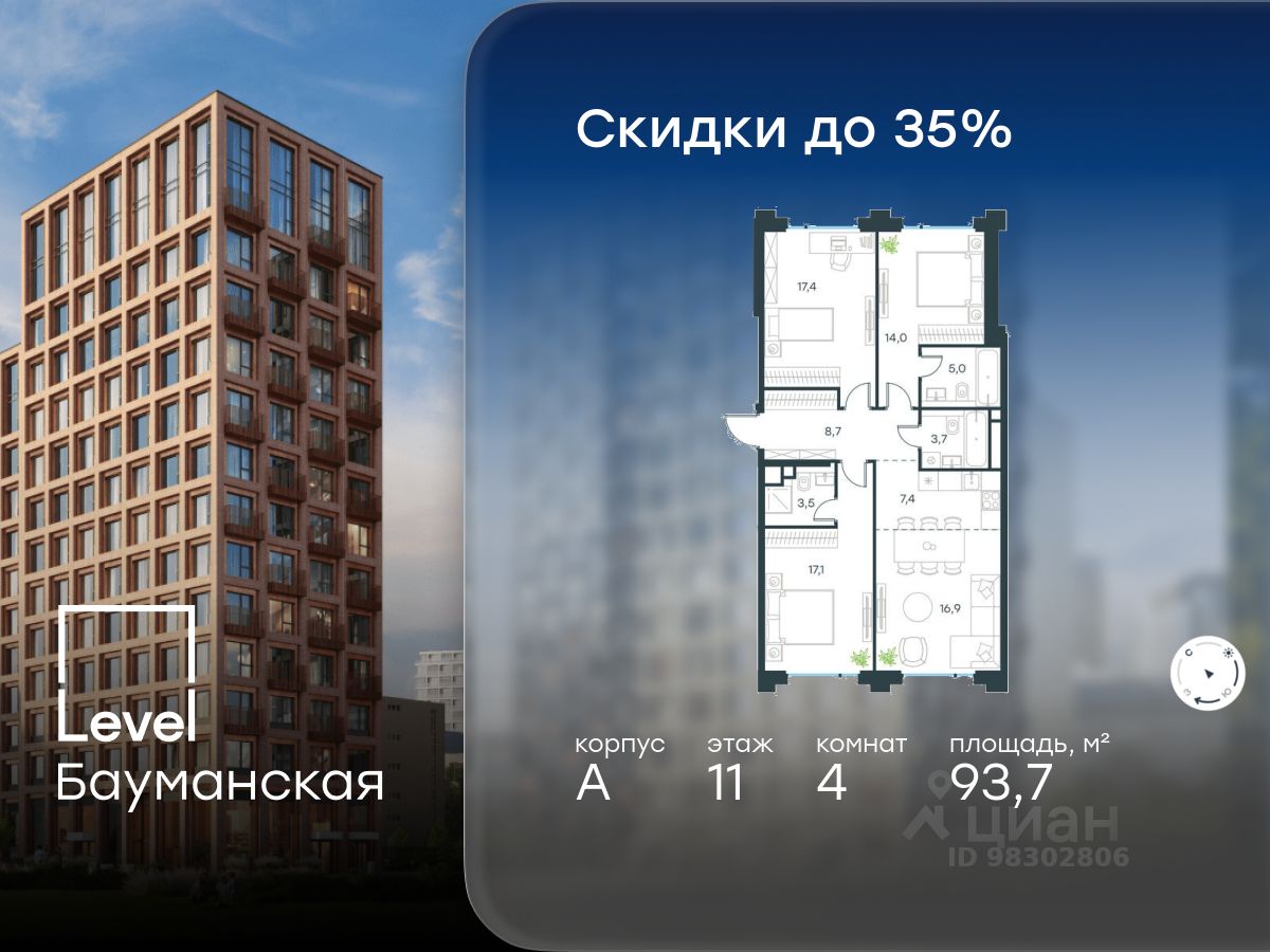 В Басманном районе (ЦАО) продается 4-комнатная квартира площадью 93.70 кв.м без отделки. Квартира расположена на 11 этаже 11-этажного корпуса " A" в жилом комплексе бизнес-класса Level Бауманская (компания Level Group).