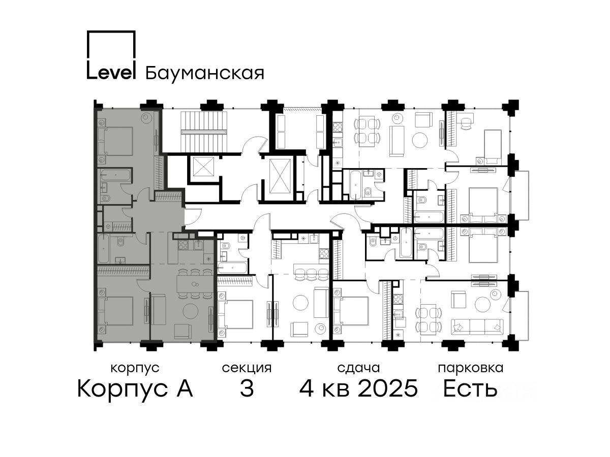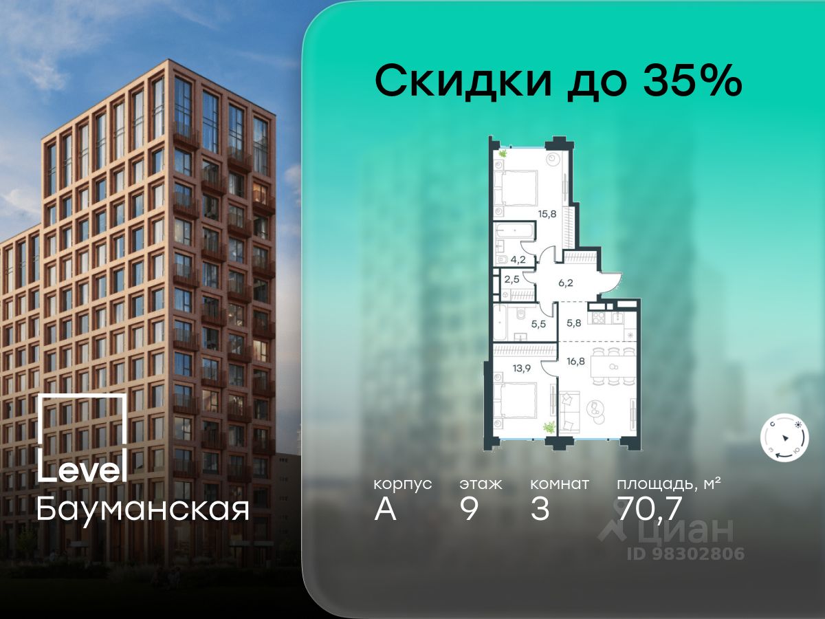 В Басманном районе (ЦАО) продается 3-комнатная квартира площадью 70.70 кв.м без отделки. Квартира расположена на 9 этаже 13-этажного корпуса " A" в жилом комплексе бизнес-класса Level Бауманская (компания Level Group).
