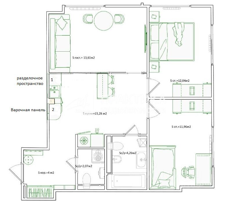 • функциональная планировка: большая кухня-столовая, три изолированные комнаты, два санузла
