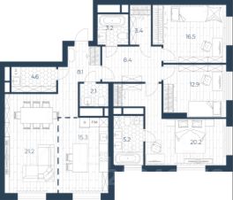 Просторная 4-комнатная квартира площадью 124,1 кв.м на высоком 18-м этаже в корп. 1 с функциональной планировкой: кухня 15,5 кв.м, гостиная 21,4 кв.м (с возможностью их объединения в кухню-гостиную), просторная мастер-спальня 20,4 кв.м с большой ванной 5,9 кв.м с окном и гардеробной, спальня 16,7 кв.м, детская 13 кв.м, ванная и санузел, две постирочные с гардеробной.