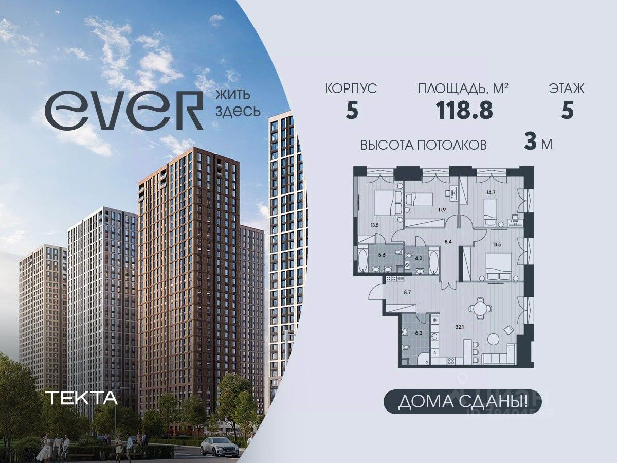 5-комн. квартира в ЖК "Ever" на 5 этаже в 34 этажном здании Корпус 5. Общая площадь: 118.8 кв.м., жилая: 79.2 кв.м. Высота потолков 3.00 м.