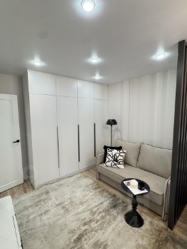 - Зона гостиной изолирована при помощи декоративной перегородки, с раскладывающимся диваном, рабочим местом и ТВ зоной, удобно для проживания и приема гостей