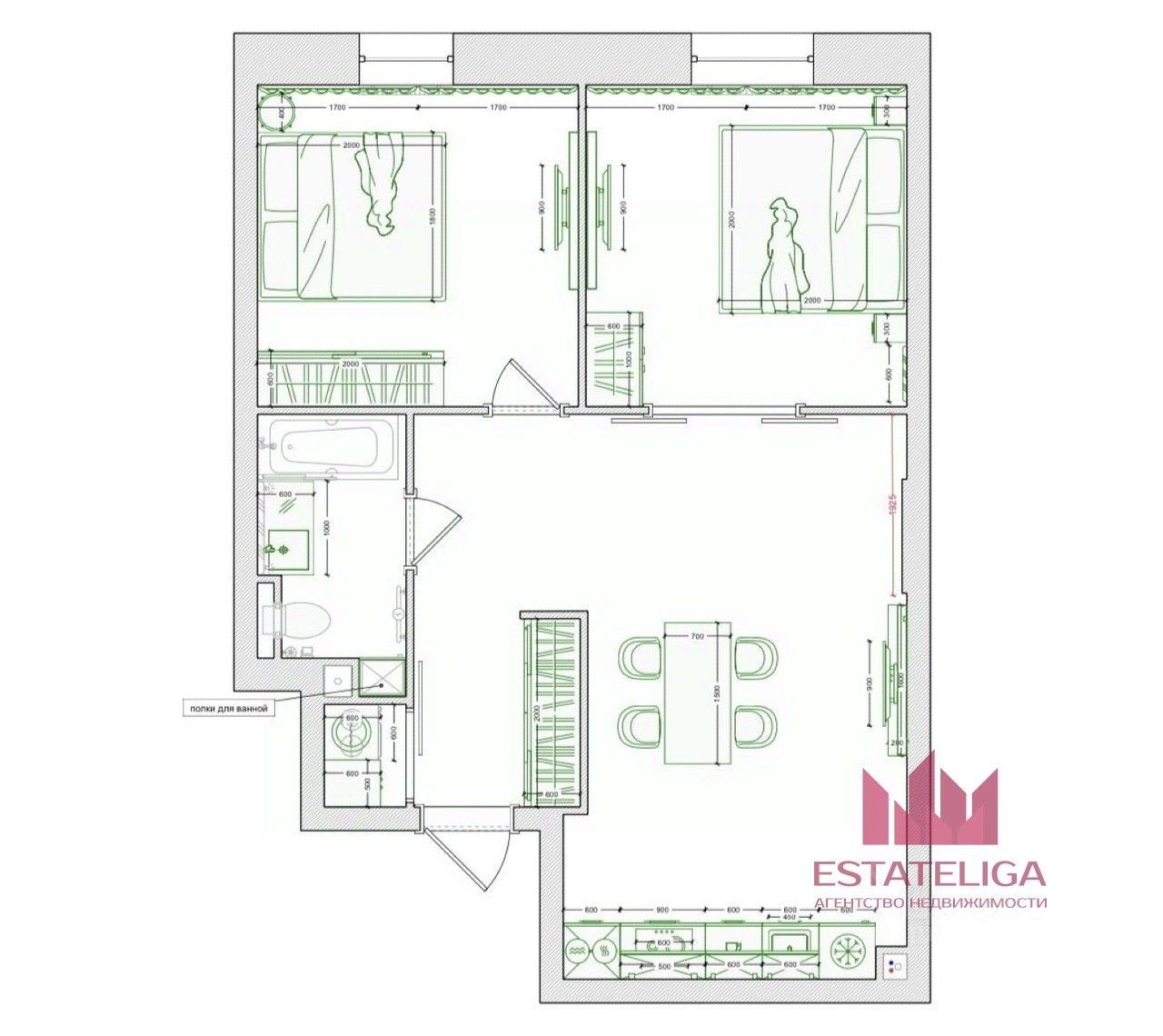 - Планировка: 2 изолированные комнаты и кухня-гостиная