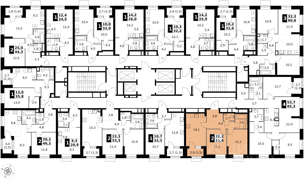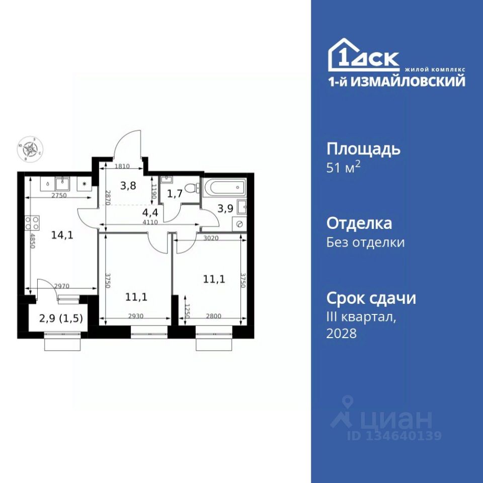 Продаётся 2-к квартира номер 436 общей площадью 51.6 кв.м. на 3-м этаже 32 этажного здания. Без отделки.