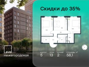 В активно развивающемся районе на юго-востоке столицы продается 2-комнатная квартира площадью 58,1 кв.м с отделкой "white box".. Квартира расположена на 13 этаже 29-этажного этажного корпуса 5 в жилом комплексе комфорт-класса Level Нижегородская (компания Level Group/Левел групп).