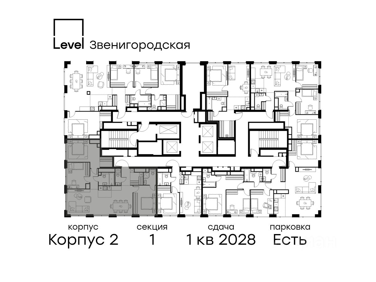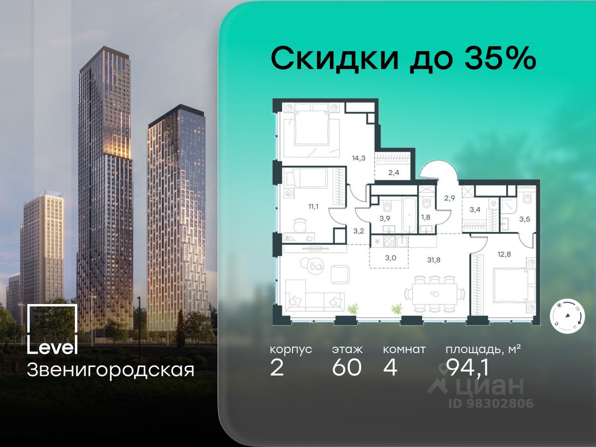 В жилом квартале продаётся 4-комнатная квартира площадью 94.10 кв.м без отделки. Квартира расположена на 60 этаже 64 этажного корпуса 2 в жилом комплексе комфорт класса Level Звенигородская (компания Level Group/Левел групп).