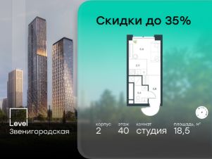 В жилом квартале продаётся студия площадью 18.50 кв.м без отделки. Квартира расположена на 40 этаже 64 этажного корпуса 2 в жилом комплексе комфорт класса Level Звенигородская (компания Level Group/Левел групп).