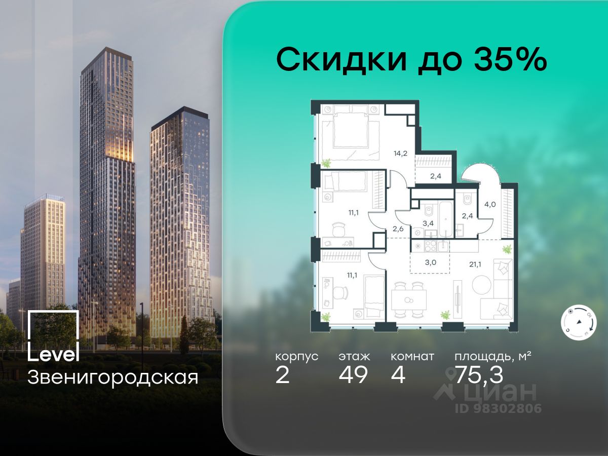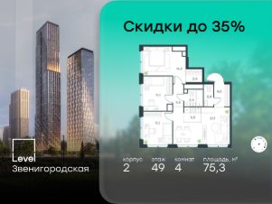 В жилом квартале продаётся 4-комнатная квартира площадью 75.30 кв.м без отделки. Квартира расположена на 49 этаже 64 этажного корпуса 2 в жилом комплексе комфорт класса Level Звенигородская (компания Level Group/Левел групп).