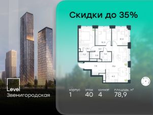В жилом квартале продаётся 4-комнатная квартира  площадью 78.90 кв.м white box. Квартира расположена на 40 этаже 48 этажного корпуса  1 в жилом комплексе комфорт класса Level Звенигородская (компания Level Group/Левел групп).