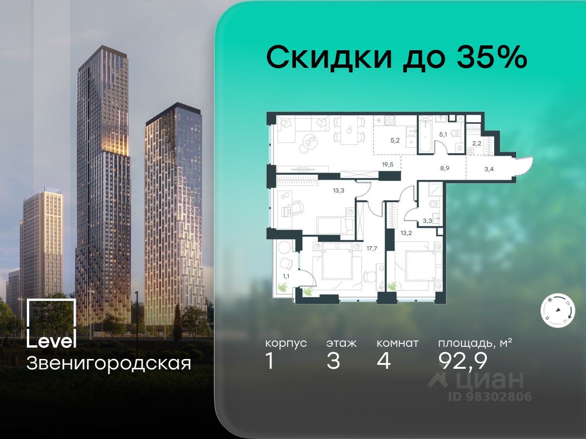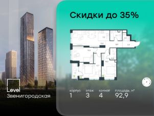 В жилом квартале продаётся 4-комнатная квартира  площадью 92.90 кв.м white box. Квартира расположена на 3 этаже 48 этажного корпуса  1 в жилом комплексе комфорт класса Level Звенигородская (компания Level Group/Левел групп).