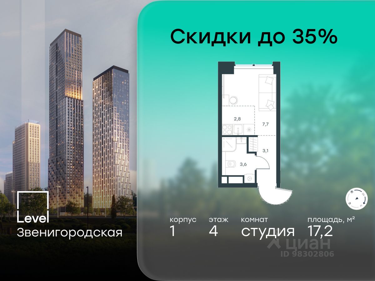 В жилом квартале продаётся студия площадью 17.20 кв.м white box. Квартира расположена на 4 этаже 48 этажного корпуса 1 в жилом комплексе комфорт класса Level Звенигородская (компания Level Group/Левел групп).