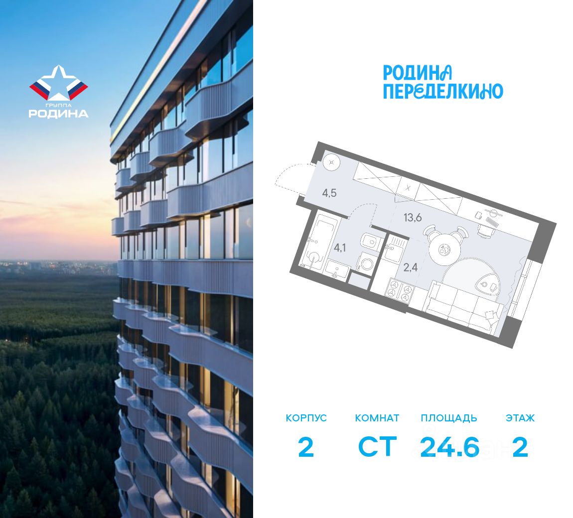 Продаётся студия площадью 24.6 м² на 2 этаже в Жилом Комплексе "Родина Переделкино".