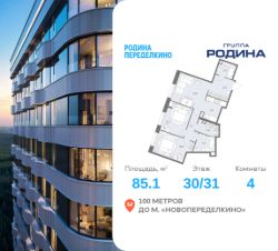 Продаётся 4-комнатная квартира площадью 85.1 м² на 30 этаже в Жилом Комплексе "Родина Переделкино".