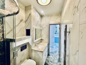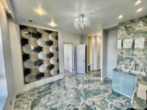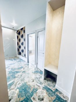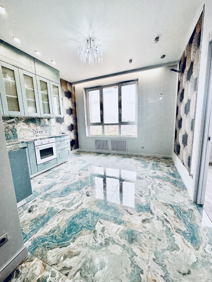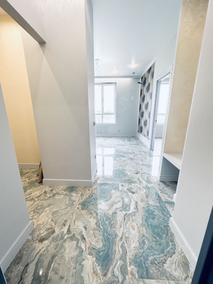 - На полу крупноформатный керамогранит, в спальне кварц-виниловый ламинат 34 класс!