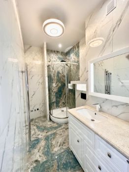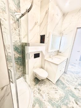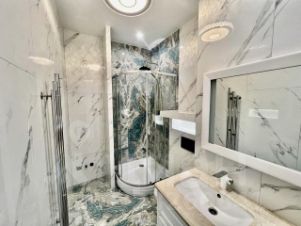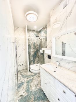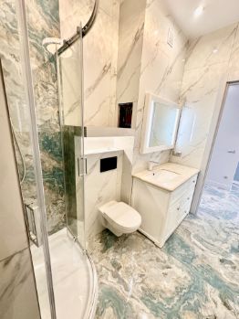 В санузле установлена мебель Godi , столешница натуральный МРАМОР. Просторная душевая (110 на