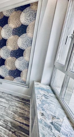 Столешница, фартук и подоконники сделаны на заказ из керамогранита. В спальне подоконник увеличен, под ним предусмотрены места хранения, сам подоконник может быть использован как зона отдыха или рабочая зона.