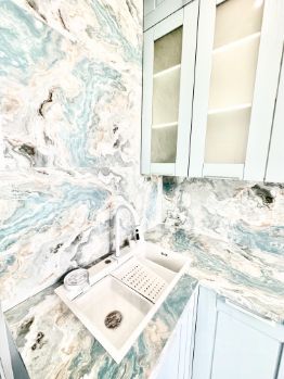 В кухне установлена многофункциональная мойка с выдвижным смесителем, есть режим мойкой под высоким давлением, в том числе отдельно для стаканов и бутылок, две дополнительные чаши для мытья овощей и прочего.