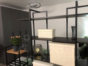 В спальной зоне расположена двуспальная кровать с подъемным механизмом, позволяющим использовать пространство под ней в качестве дополнительной зоны хранения, а также вместительный большой шкаф с полками и рейлингами, выделено место для туалетного столика.