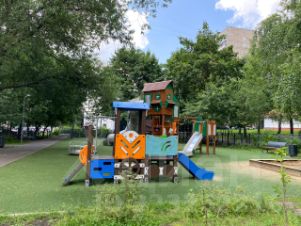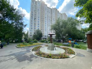 Тихий двор, утопающий в зелени, с собственным фонтаном, детской площадкой и зоной воркаута.