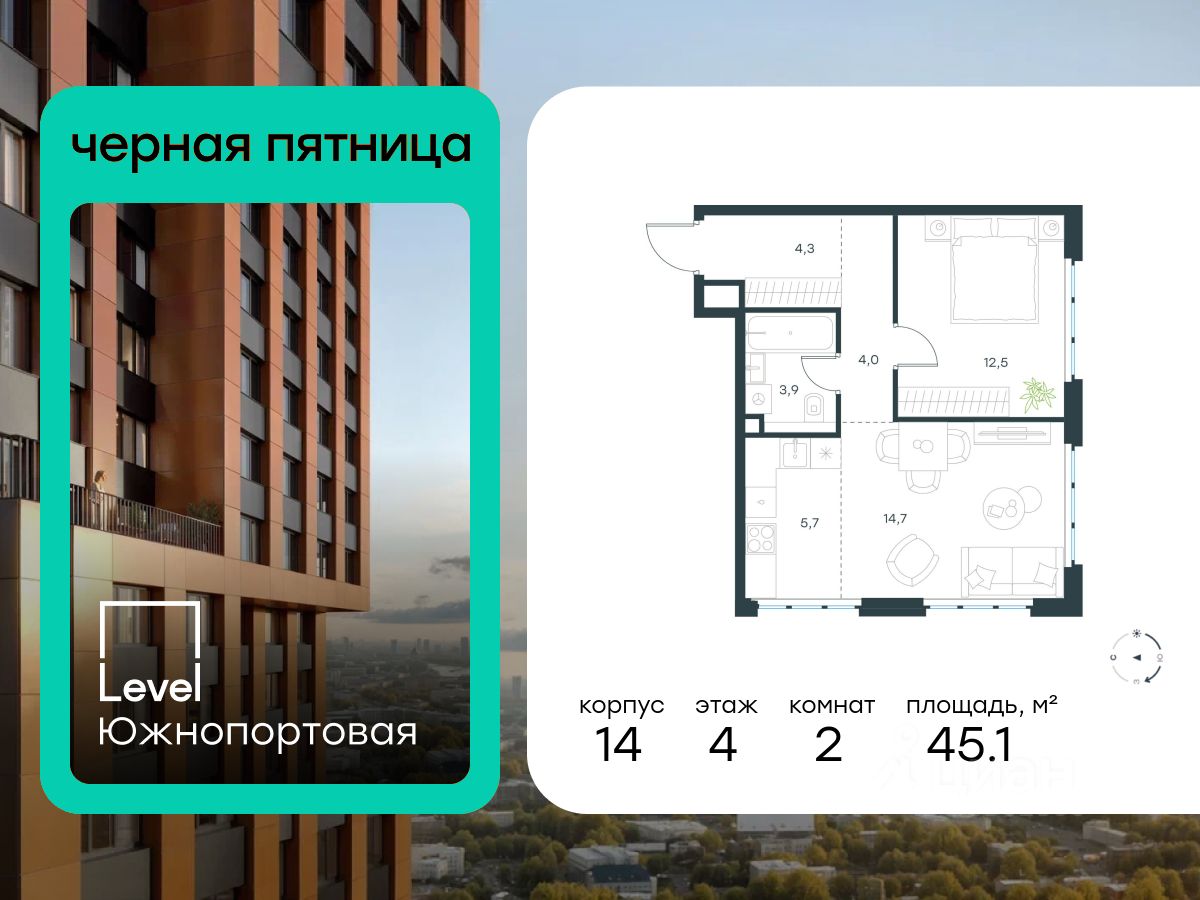 В северной части района Печатники продается 2-комнатный апартамент площадью 45.10 кв.м без отделки. Апартаменты расположены на 4 этаже 13-этажного корпуса 14 в жилом комплексе комфорт-класса Level Южнопортовая (компания Level Group/Левел групп).