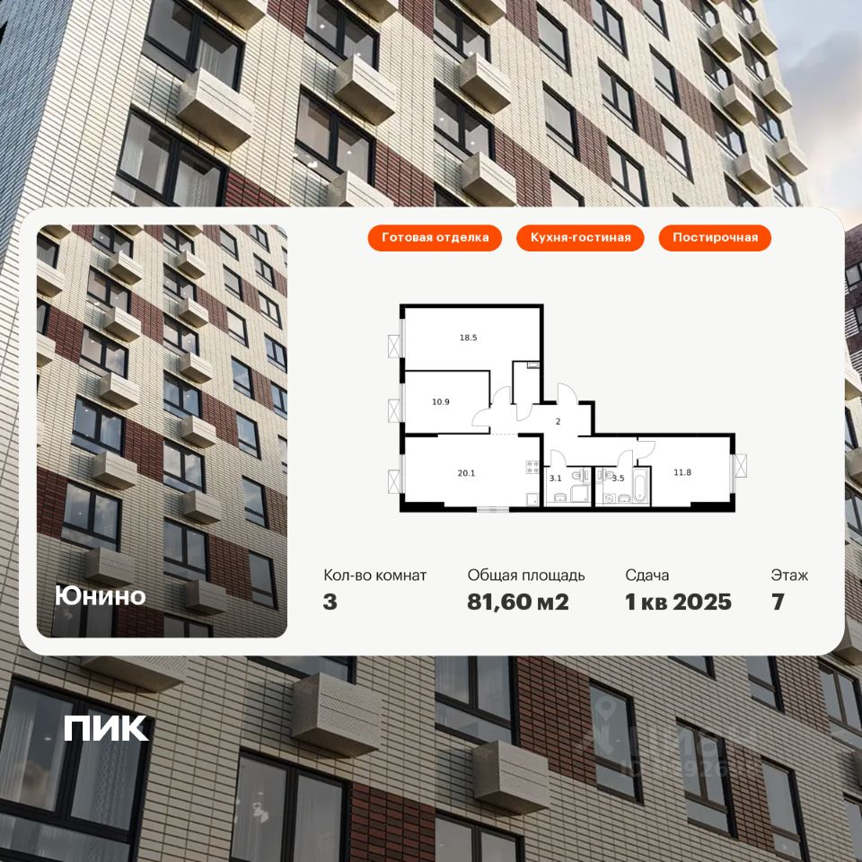 Продаётся 3-комн. квартира площадью 81,6 кв.м на 7 этаже 17 этажного дома (Корпус 1.1, Секция 2) проекта ПИК Юнино. Светлый просторный подъезд на уровне земли, функциональная планировка, большие окна, c отделкой.