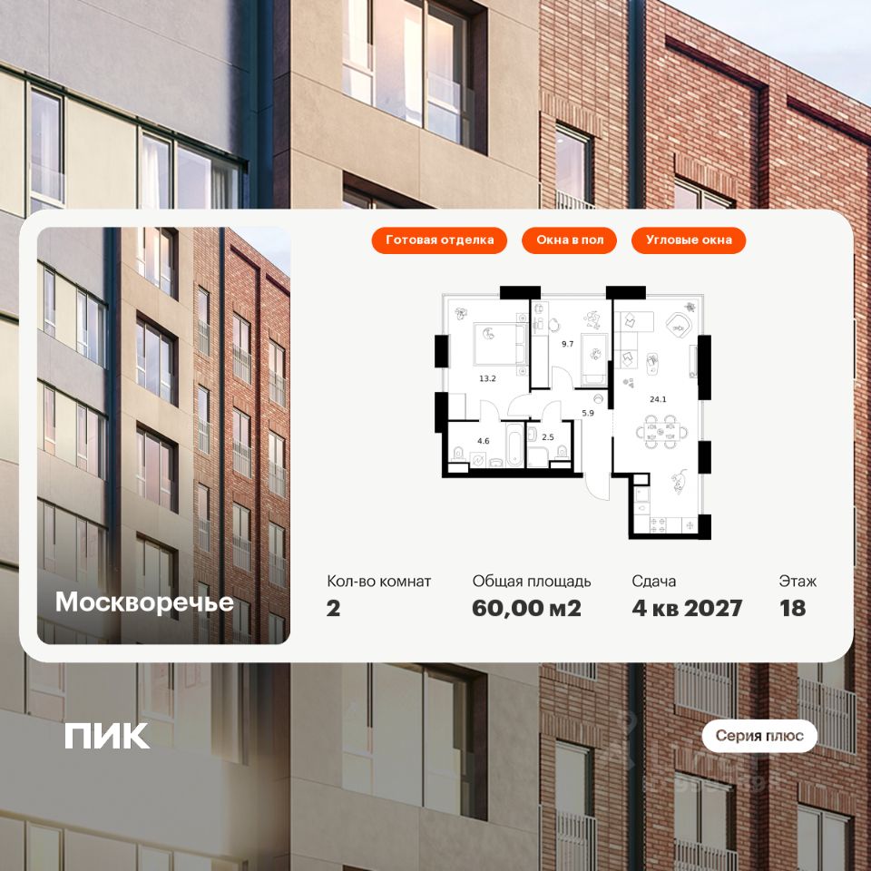 Продаётся 2-комн. квартира площадью 60 кв.м на 18 этаже 39 этажного дома (Корпус 1.3, Секция 4) проекта ПИК Москворечье. Светлый просторный подъезд на уровне земли, функциональная планировка, большие окна, c отделкой.