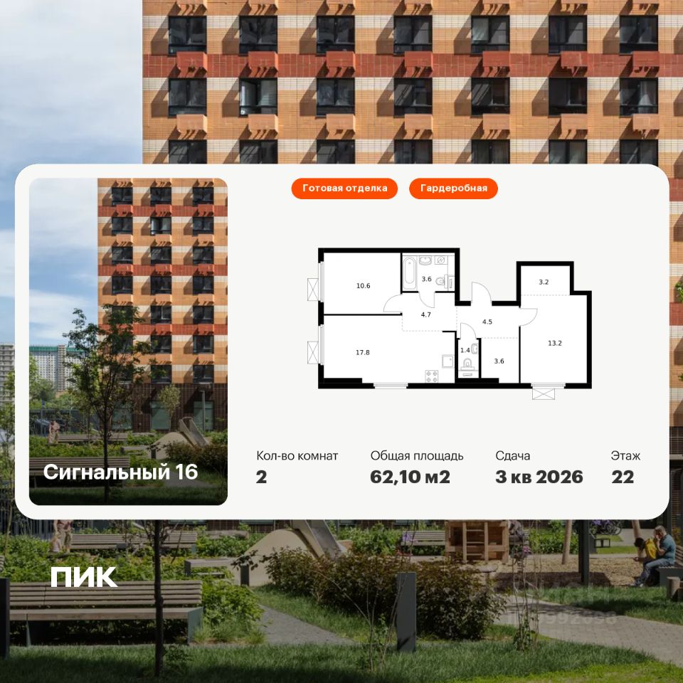 Продаётся 2-комн. квартира площадью 62,1 кв.м на 22 этаже 33 этажного дома (Корпус 2.1.1, Секция 1) проекта ПИК Сигнальный 16. Светлый просторный подъезд на уровне земли, функциональная планировка, большие окна, c отделкой.
