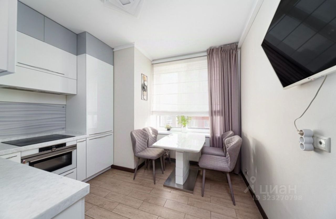 — Кухня со встроенной техникой, обеденной зоной у окна и ТВ-зоной