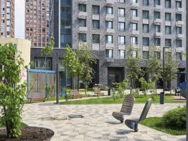 "Двор без машин" с детскими и спортивными площадками, зонами отдыха и ландшафтным дизайном.