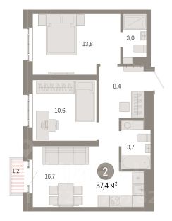 Квартира с кухней-гостиной и двумя спальнями в квартале Метроном