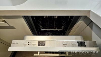 Квартира оборудована встроенной техникой GRAUDE: посудомоечная машина, духовка, микроволновая машина, холодильник, варочная панель.