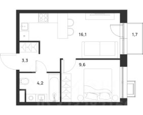 Планировка включает просторную кухню-гостиную, спальню и балкон.