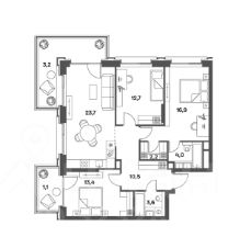 3 спальные комнаты: 13.4-12.7-16.9 м²