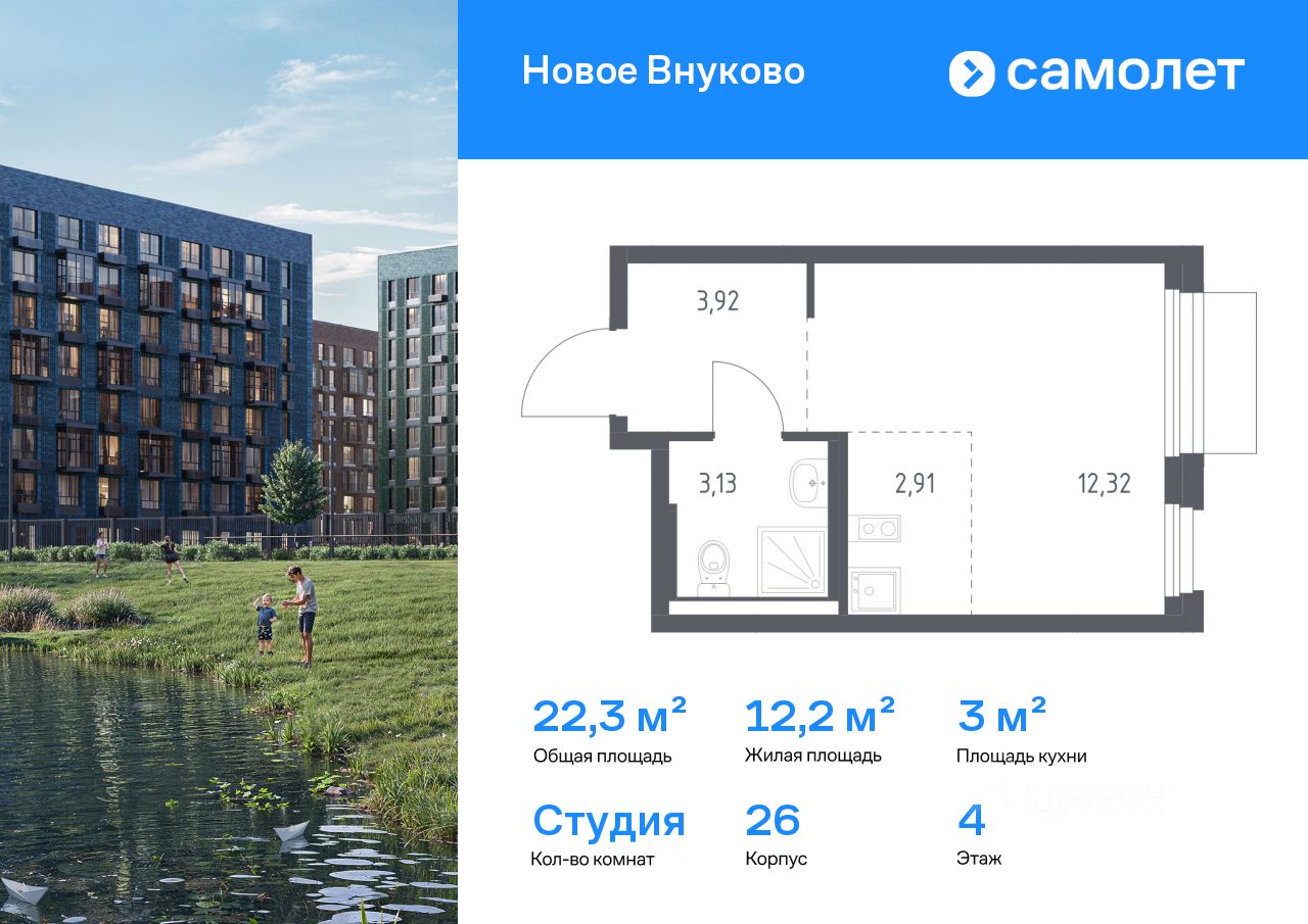 Строим кварталы для жизни с заботой о будущем. Предлагается квартира студия комфорт-класса 22,28 кв.м в корпусе 26 на 4 этаже, в ЖК "Новое Внуково"