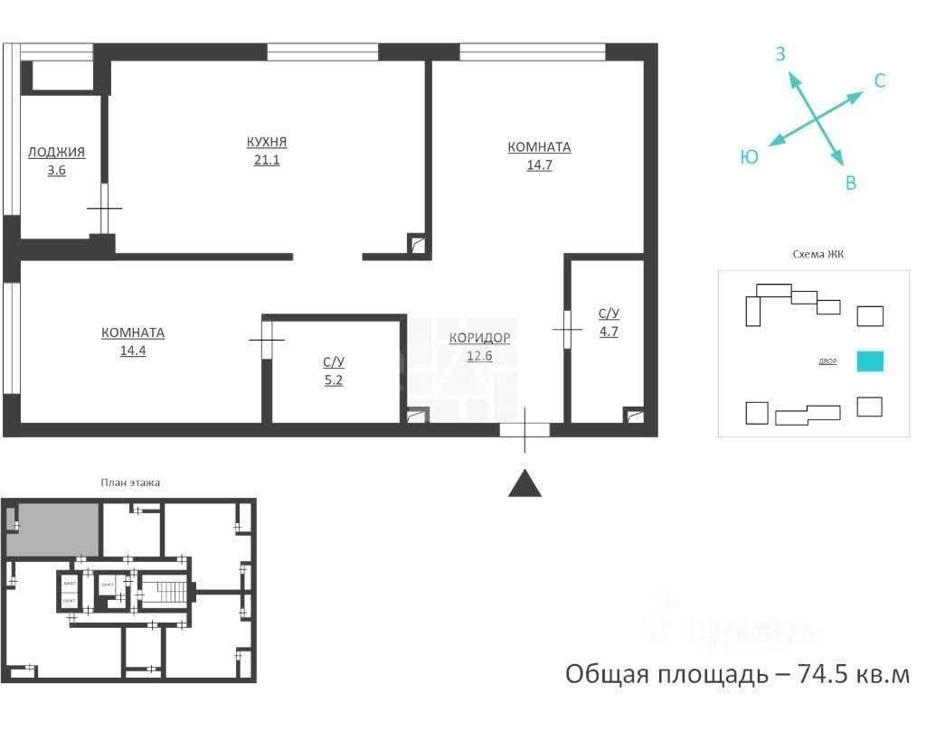 Удобная продуманная планировка предусматривает: просторную кухню 21.1 м2 с выходом на лоджию 3.6 м2, 2 две изолированные комнаты 14.7 м2 и 14,2 м", 2 санузла 5,2 м2 и 4.7м2.