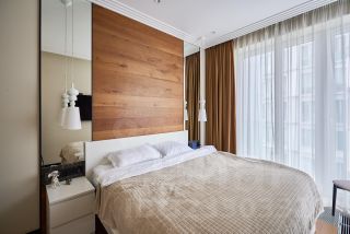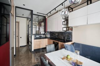 - Несмотря на небольшую площадь, она имеет очень грамотную планировку, включающую в себя: уютную кухню-гостиную с выходом на лоджию,  2 вместительные спальни, 2 сан. узла, гардеробную и просторный коридор.