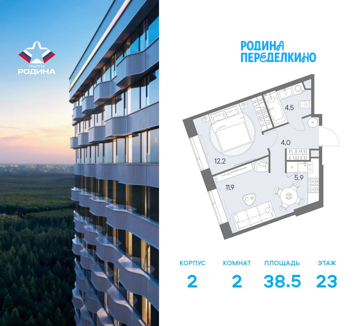 Продаётся 2-комнатная квартира площадью 38.5 м² на 23 этаже в Жилом Комплексе "Родина Переделкино".