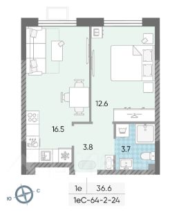 Продаётся уютная, светлая 1-комнатная квартира площадью 36,6 м²: комната 12,6 м², просторная кухня-гостиная 16,5 м² — хорошая планировка для жизни и работы из дома