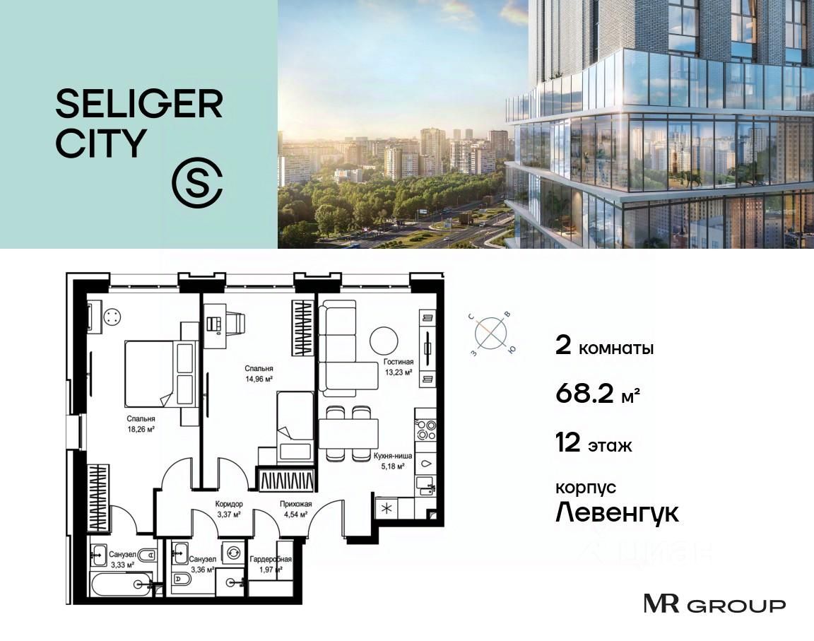 Продаётся 2-комнатная квартира общей площадью 68.20 м² без отделки в ЖК "Селигер Сити" на 12-м этаже 21 этажного дома.