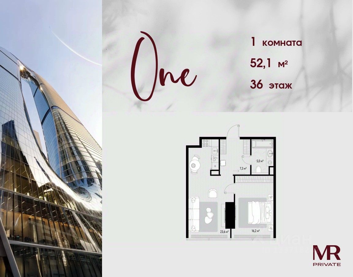 В продаже 1-комнатная квартира площадью 52.10 м² на 36-м этаже.