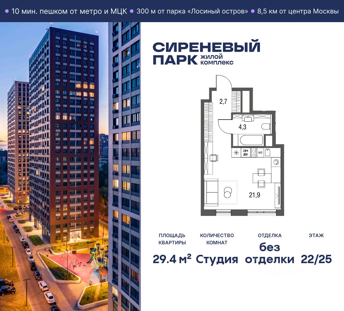 Продаётся просторная студия общей площадью 29.4 м² на 22 этаже в новом жилом комплексе "Сиреневый парк", расположенном в Восточном административном округе Москвы на улице Тагильская. Всего 10 минут ходьбы от станции метро "Бульвар Рокоссовского" и одноимённой платформы МЦК.